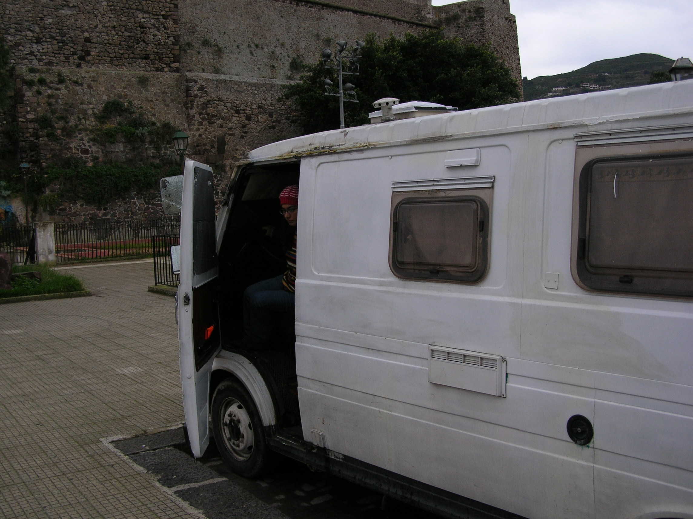 La sveglia del mattino e' una cosa meravigliosa! Il posto e' bellissimo e la vista sul mare e' stupenda, per giunta proprio sotto il castello di Lipari... siamo costretti ad uscire dalla porta lato guidatore, perche' il portellone, dopo la devastazione dell'altro giorno, preferiamo tenerlo definitivamente chiuso in attesa delle riparazioni al ritorno. :)