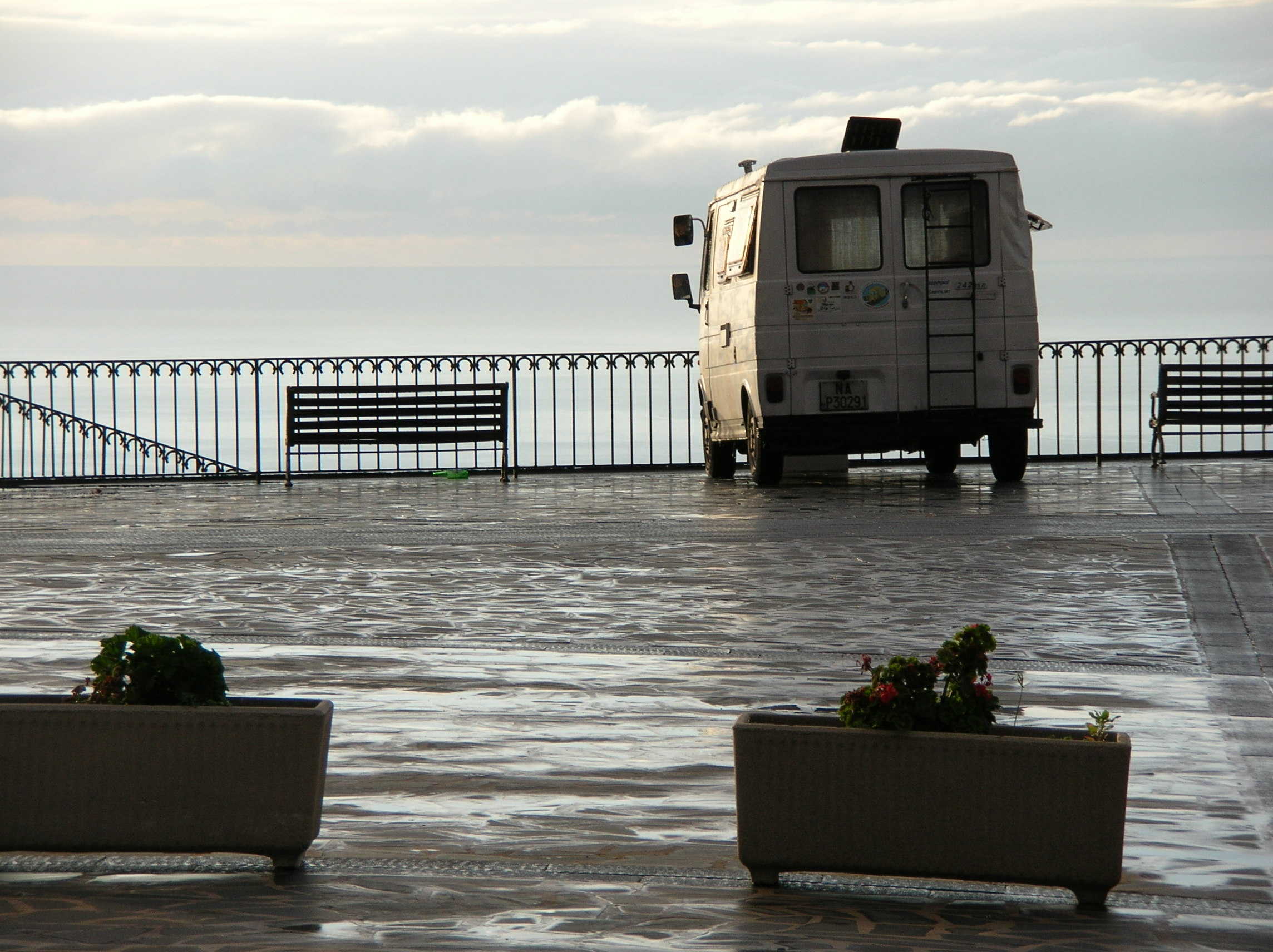 La sveglia del mattino e' una cosa meravigliosa! Il posto e' bellissimo e la vista sul mare e' stupenda, per giunta proprio sotto il castello di Lipari... siamo costretti ad uscire dalla porta lato guidatore, perche' il portellone, dopo la devastazione dell'altro giorno, preferiamo tenerlo definitivamente chiuso in attesa delle riparazioni al ritorno. :)