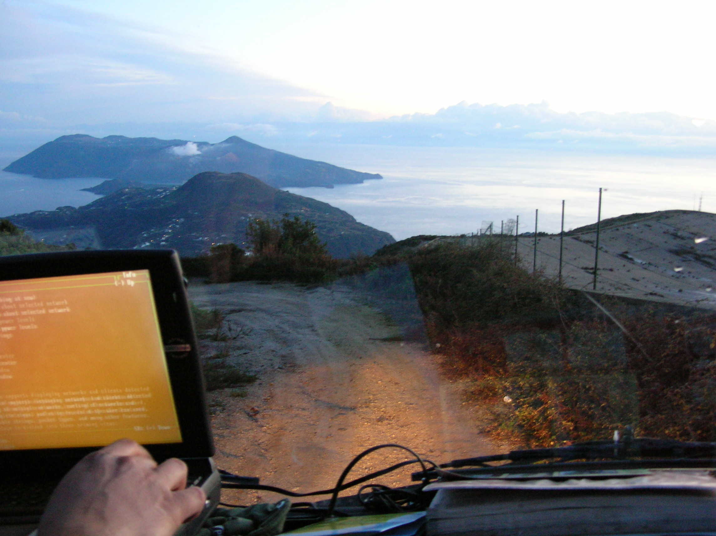 Girando ancora per l'isola, decidiamo di arrampicarci fino in cima alla montagna: ho infatti scoperto una stradina piccina, in parte cementata, in parte sterrata, che porta proprio sul cocuzzolo dell'isola, dove ci sono le antenne radio ed il sistema di raccolta delle acque piovane ... da qua si vede tutto attorno, siamo proprio in cima, ed il 242 non ha fatto una piega ... al ritorno, incrociamo 2 fuoristrada che ci guardano ad occhi spalancati :)